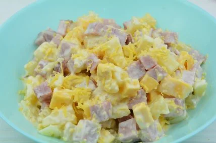 - Змішати всі інгредієнти, заправити майонезом, посолити за смаком.