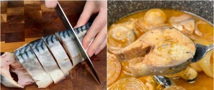 - Скумбрію помити, почистити, нарізати на порційні шматочки.