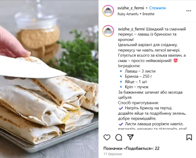 Особливо добре лаваш поєднується з бринзою та свіжою зеленню, утворюючи хрусткі рулетики — ідеальний варіант для сніданку, пікніка чи несподіваних гостей. А головне — готувати їх швидко, просто і без зайвого клопоту. Рецептом з нами поділилися на Instagram-сторінці "svizhe_z_fermi".