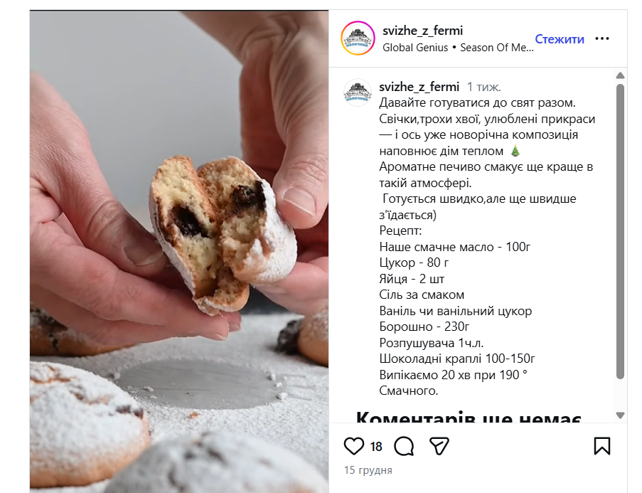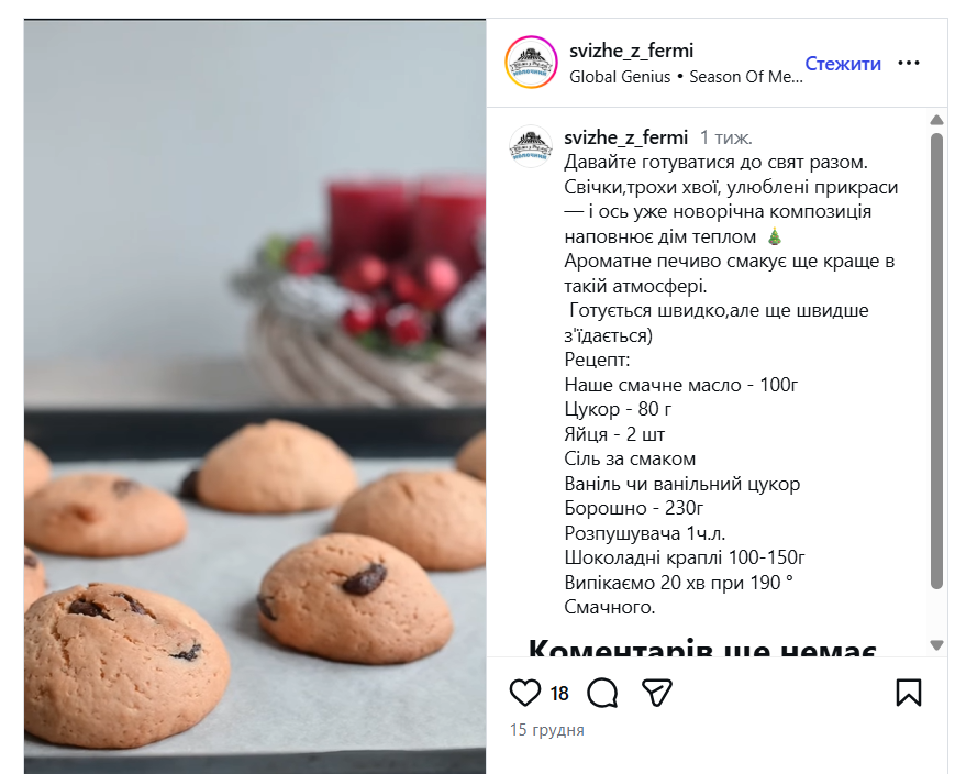 Украинцы традиционно пекут печенье и всевозможные сладости к новогоднему столу. Одним из любимых десертов является шоколадное печенье, которое готовится быстро и всегда дарит хорошее настроение. Сегодня мы предлагаем вариант с шоколадными каплями – нежное, ароматное и простое в приготовлении. Рецептом с нами поделились на Instagram-странице "svizhe_z_fermi".